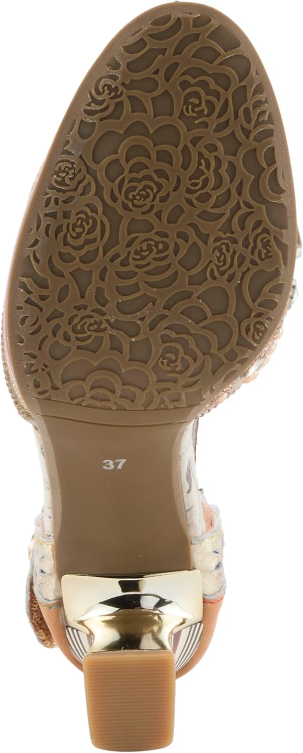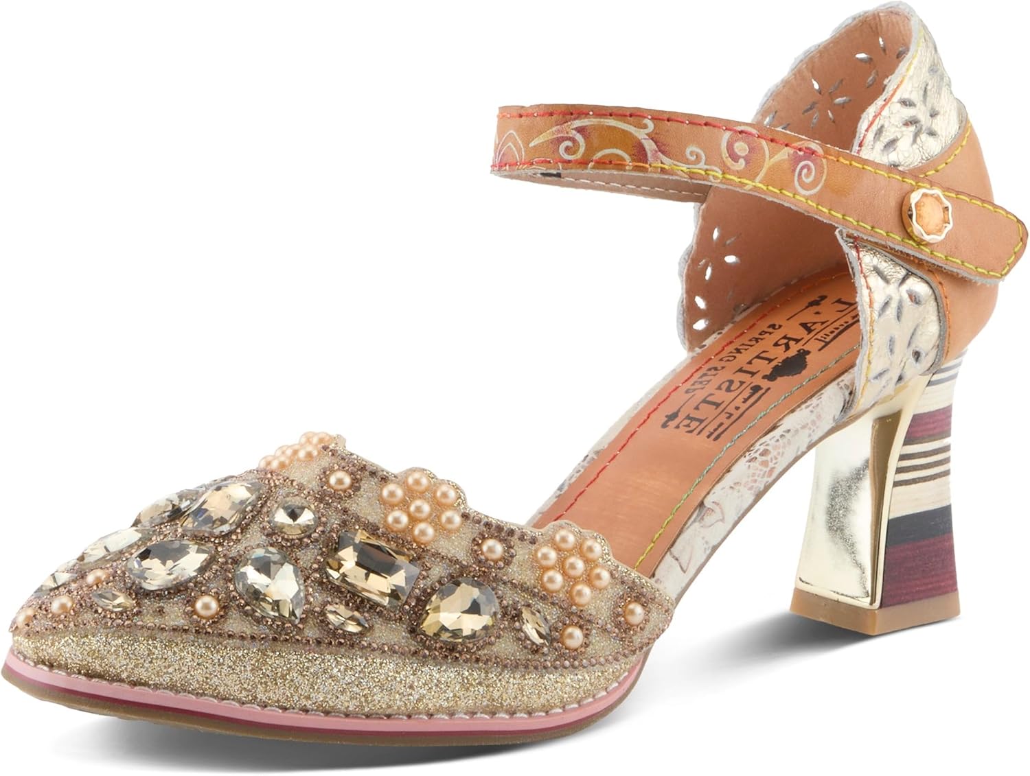 Step into refined glamour with the L`Artiste Queenlatifah closed-toe heels, designed to balance artistry and elegance effortlessly. This stunning shoe showcases an upper crafted from a blend of leather and non-leather materials featuring an intricately detailed vamp adorned with sparkling stones, faceted crystals, and a subtle glitter finish that catches the light beautifully with every step. The adjustable hook-and-loop strap ensures a secure, customizable fit and is accented with a delicate stone set in a sleek metal casing for an understated yet sophisticated look. The 3-inch block heel offers stability and grace, while the floral-embossed outsole reveals a hidden signature detail designed for those who appreciate beauty from every angle. Ideal for special occasions or elegant nights out, these heels combine French-inspired artistry with a comfortable cushioned insole, making them a modern masterpiece that elevates your wardrobe with bold femininity and lasting comfort.